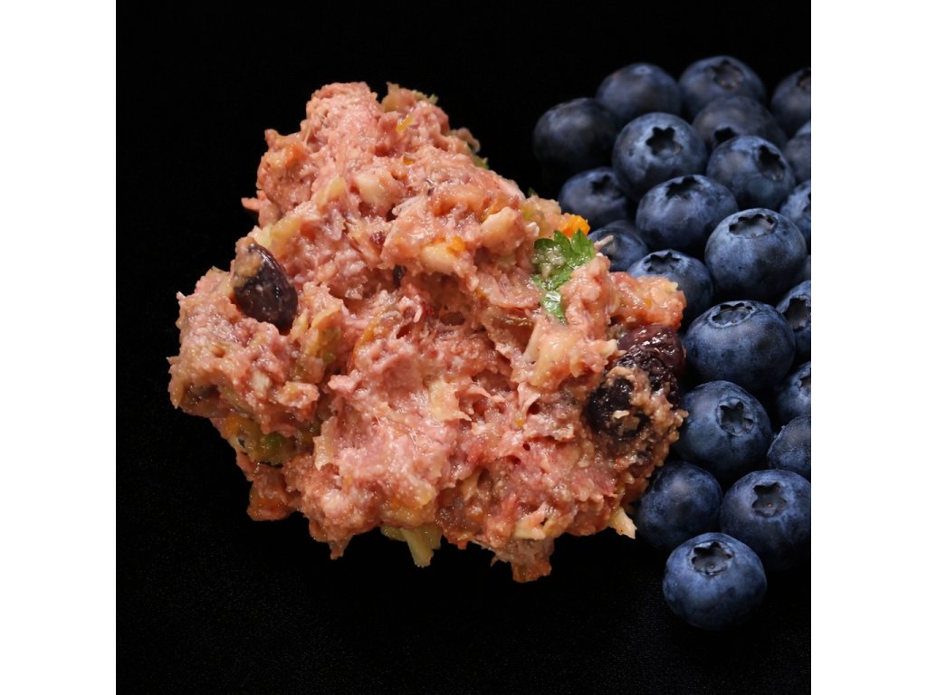 Složení: 70% jemně mleté kachní maso bez kostí a chrupavek, 30% jablko, petržel a borůvky