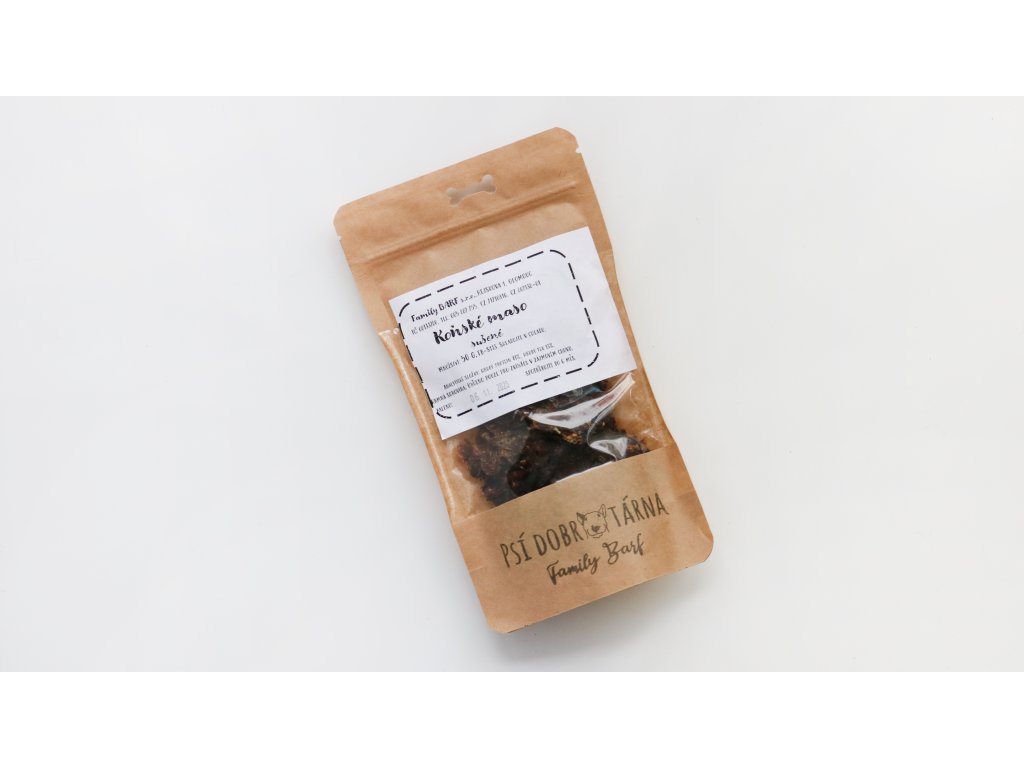 50 g, koňské maso jemně pomleté a následně vysušené, aby šlo dobře lámat